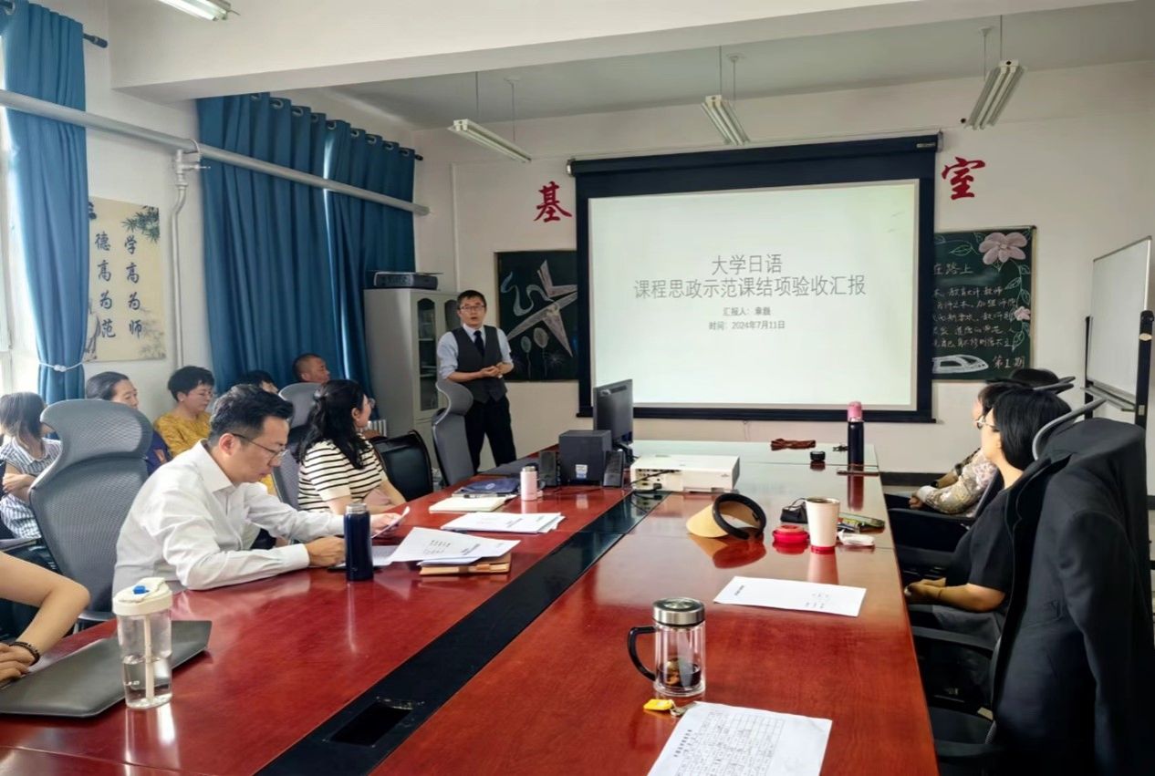 会议第三版块开展了2023年院级课程思政示范课程建设项目验收工作。《跨文化交际》《基础英语》《英语进阶》《大学日语》《通用学术英语》课程负责人分别从项目实施目标、实施过程、实施成效及下一步计划4个方面汇报了课程思政建设工作。经过一年的建设,5门课程均完成了既定目标,形成了课程特色,凝练了典型案例,体现了育人实效,验收合格,予以结项。
