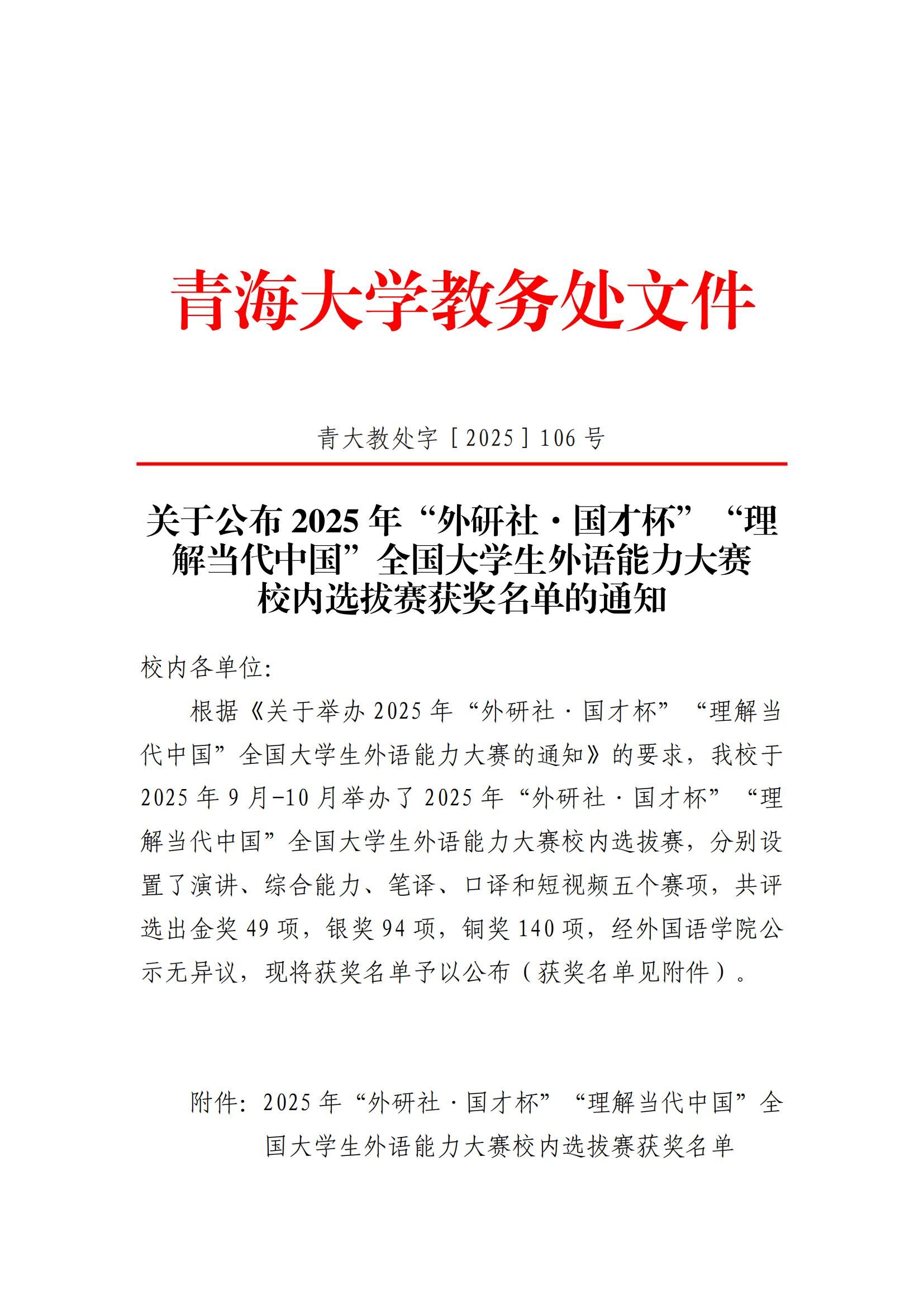 关于公布 2025 年“外研社·国才杯”“理解当代中国”全国大学生外语能力大赛 校内选拔赛获奖名单的通知